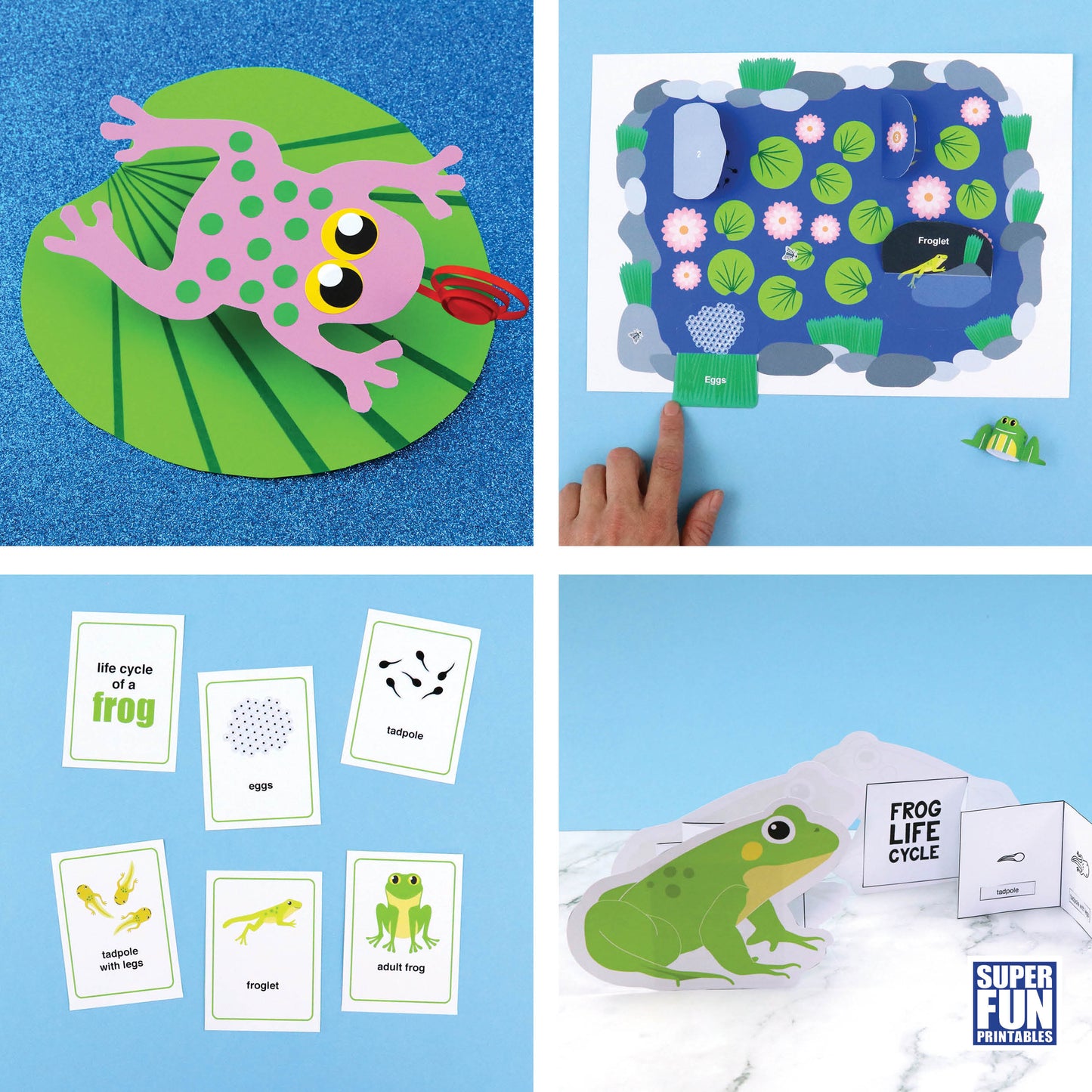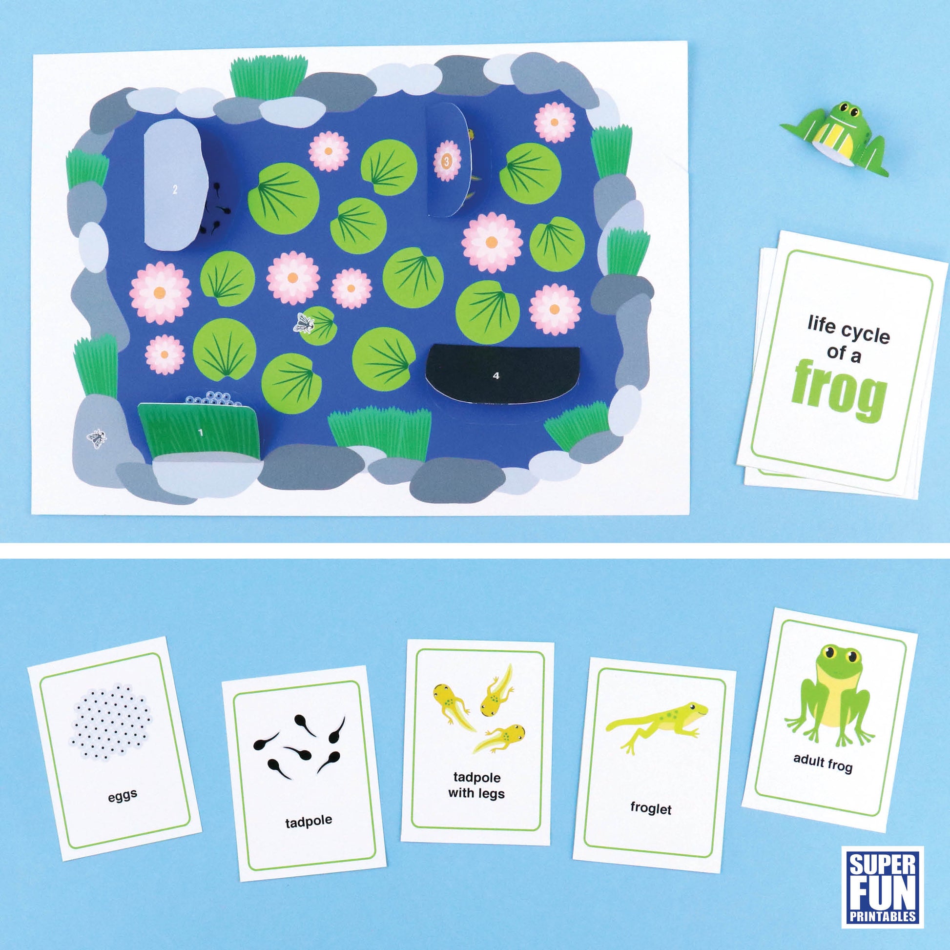 frog lifecycle playmat - print and create a lift-the-flap frog lifecycle playmat. This template includes an illustrated pond, glue-on flaps, a mini paper frog and illustrated frog lifecycle sequencing cards