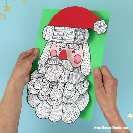 Santa's beard needs to be decorated with black and white doodle art designs (or make it colour if you want). The 3D element is created with basic cutting, folding and gluing.